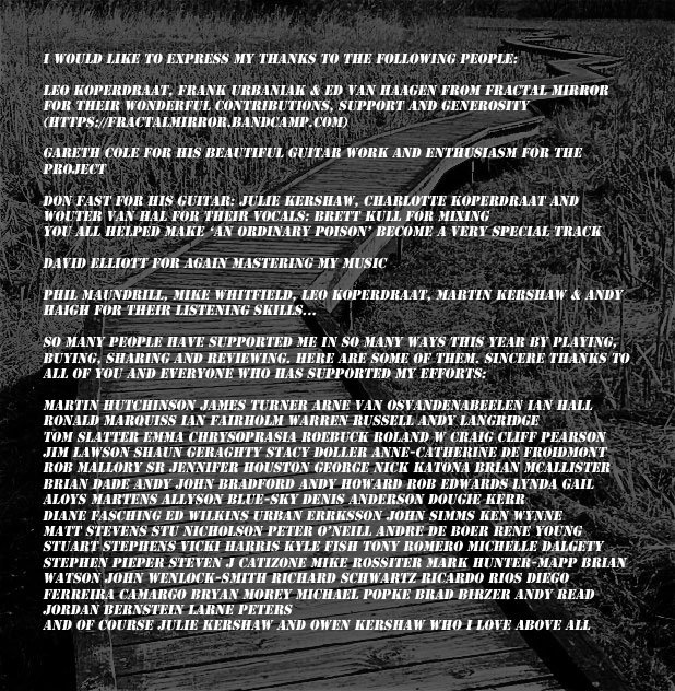 My music is for the most part atmospheric progressive rock but I leave myself free to drift in any musical direction I choose within the structure of an album.
